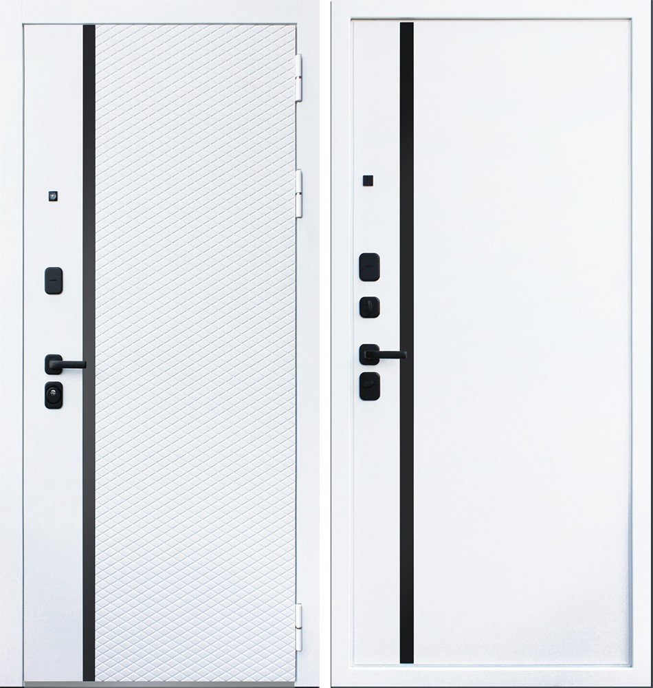 Порошковое покрытие "муар белый". Экошпонированная панель МДФ 10 мм (дизайн ФЛС). Цвет "белый матовый". Вертикальная вставка из черного глянцевого лакобеля. Объемная фрезеровка. Наличник гладкий, МДФ 80 мм.